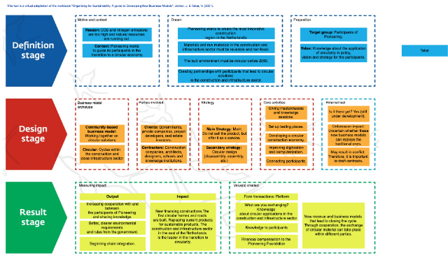 The Business Model Template offers a practical structure for developing a sustainable business model. The template consists of ten building blocks divided into three phases: the Definition phase, the Design phase and the Result phase. The building blocks are elaborated per phase and connected to each other in a consistent manner. It thus supports the joint creation of a valuable proposition with positive impact.