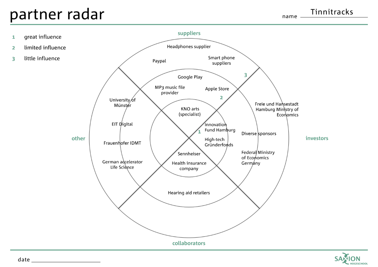 Make a large printout of the Partner Radar to use in a brainstorm. Have a look at the example of Tinnitracks to get a better understanding of what a Partner Radar can look like.